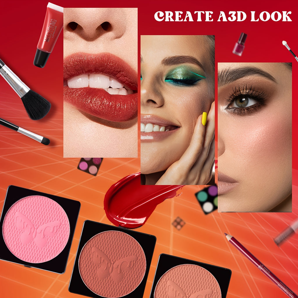 Este kit oferece uma gama completa de maquilhagem para olhos, rosto e lábios, com texturas suaves e pigmentos intensos.