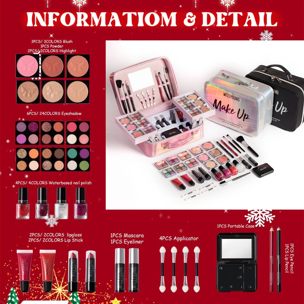 O Kit de Maquilhagem Completo Kiss Me Babe reúne sombras, máscara, verniz, batons, pincéis e espelho num único estojo multifuncional, perfeito para criar looks deslumbrantes em qualquer momento.